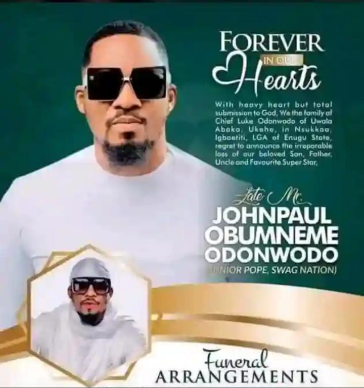 The Funeral arrangements for the burial of late Nollywood actor John Paul Odonwodo, better known by his stage name; Junior Pope have been released by his family.