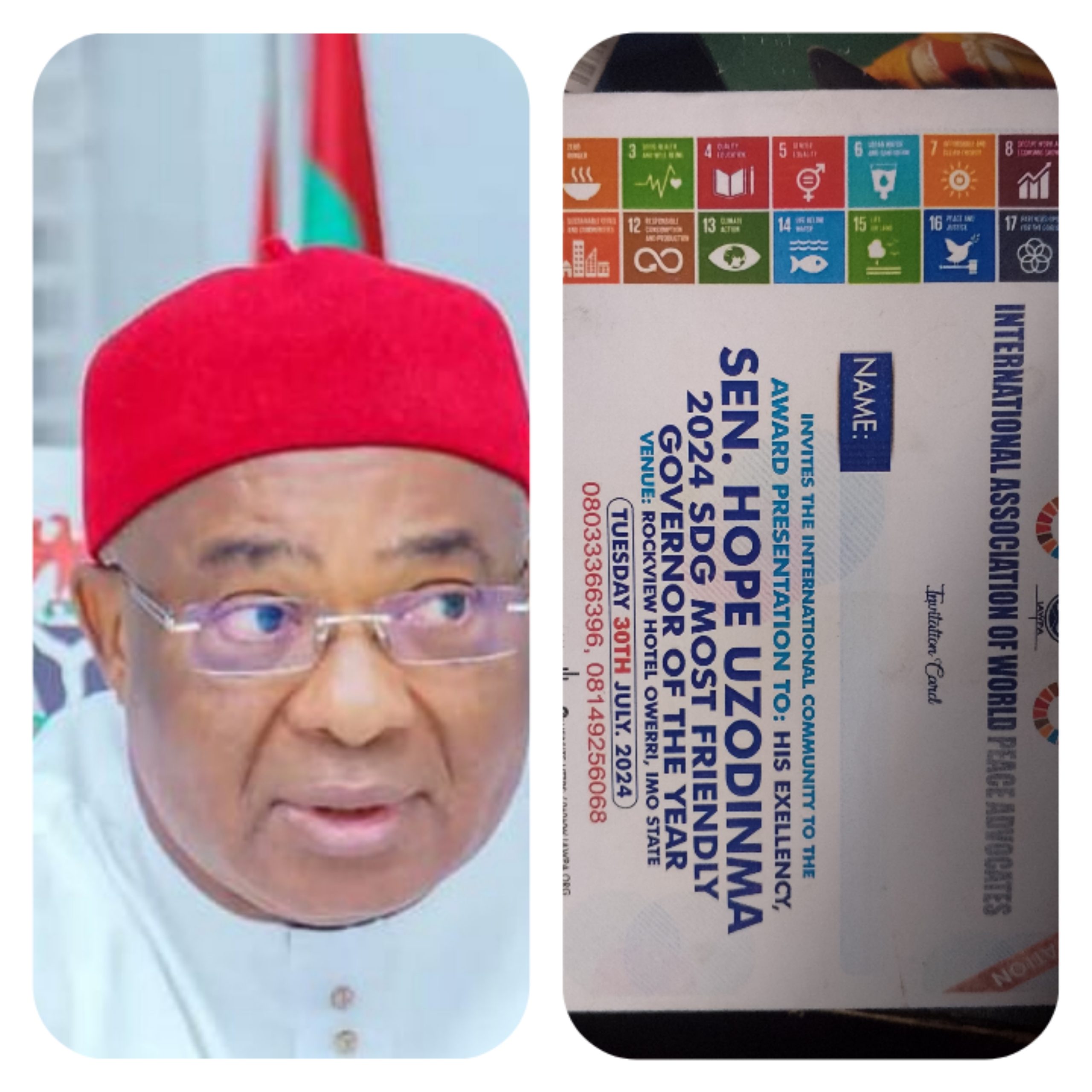 The International Association of World Peace Advocates (IAWPP) will honor Imo State Governor, Senator Hope Uzodimma, with the “2024 SDG Most Friendly Nigeria Governor of the Year” award on July 30, 2024, in Owerri, Imo State. The event, marking United Nation Friendly Day, aims to advocate for peace and security in the state.