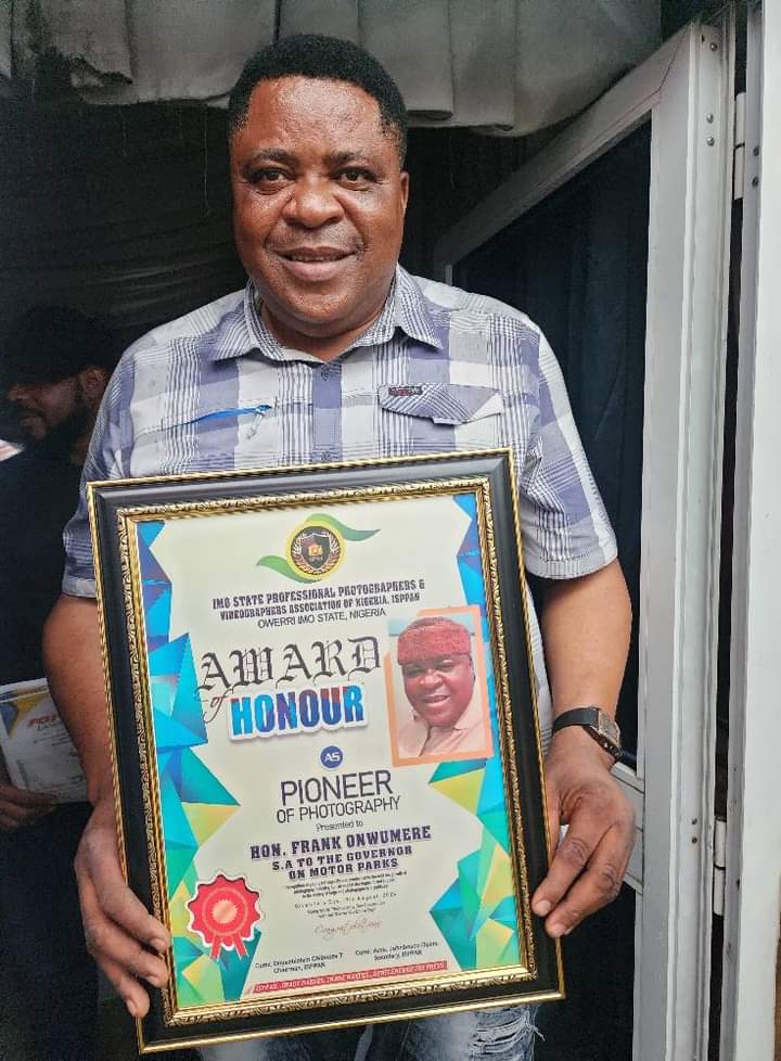 As the world mark the World photography day today, In recognition for his support and contribution to the development of Imo state and the growth of photography and photographers in the state, Hon Frank Onwumere, Special Adviser to the Governor on Motor Parks and Supervision of illegal parks in the state, today was honored by the Imo State Photographers and Videographers Association of Nigeria, (ISPPAN) as Pioneer of photography.