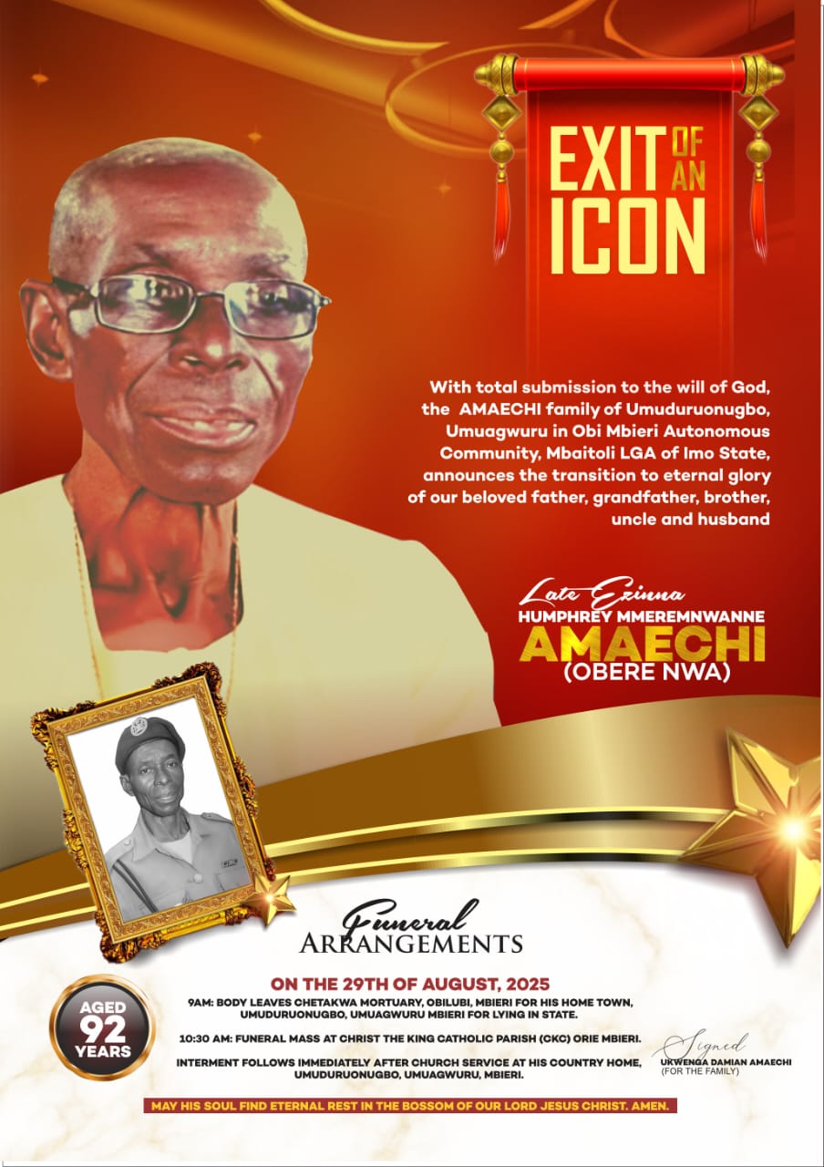 According to the burial arrangements on the invitation letter, Ezinna Humphrey Mmeremnwunne Amaechi, died at the age of 92 years old and will be buried on Friday 29 August 2025 in his country home at Umuduruonugbu Umuagwu, Obi Mbieri Autonomous Community in Mbaitoli Local Government Area of Imo State after a mass at CKC Catholic Parish Orie Mbieri.