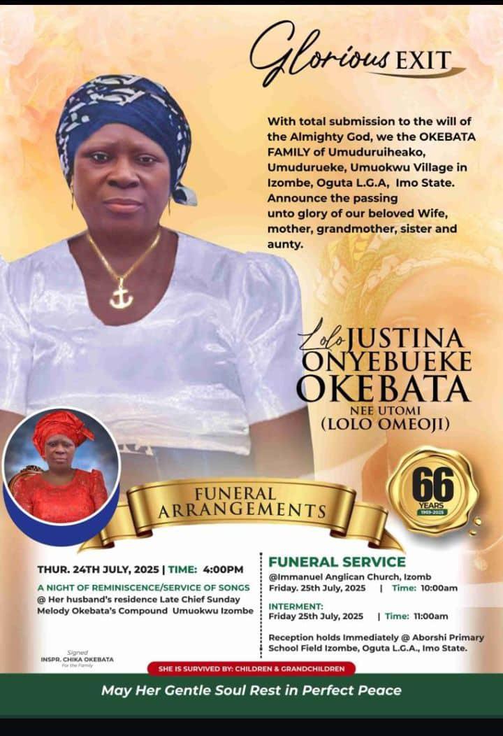 According to a statement released by her son, Inspector Chika Okebata of the Imo State Police Command, the funeral rites will begin with a requiem mass at Emmanuel Anglican Church, Izombe, on Friday, July 25, 2025. The interment will take place immediately after the service at her late husband’s compound in Umuokwu, Izombe.